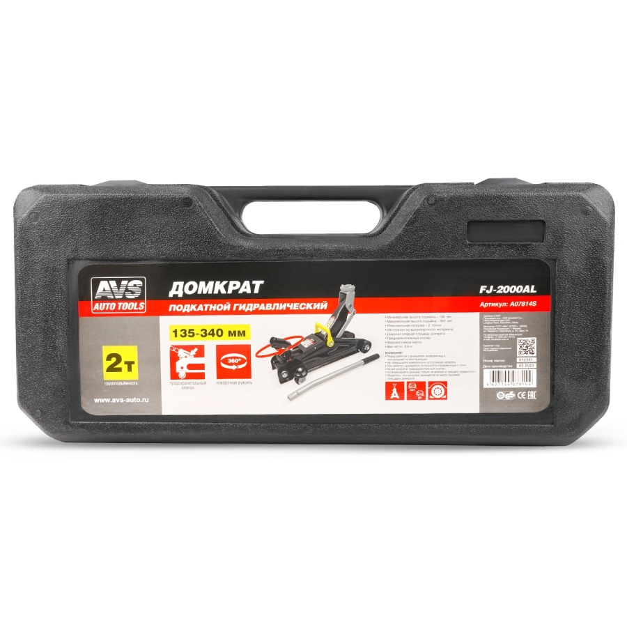 Домкрат подкатной AVS FJ-2000AL (поворотная ручка 360 градусов), 2т, 135-340мм. в кейсе