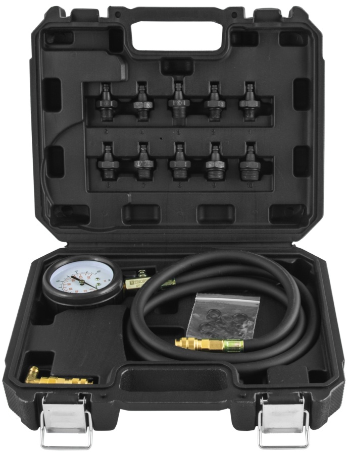 Тестер давления масла предназначен для точной диагностики давления масла в двигателе. Благодаря обширному набору адаптеров он имеет большую область применения и может использоваться для диагностики двигателей внутреннего сгорания многих моделей легковых автомобилей.