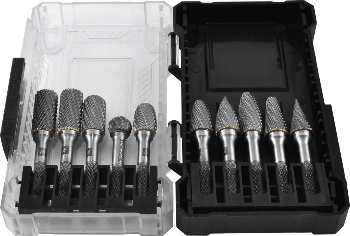 Набор борфрез твердоспланых, тип A, B, C, D, E, F, G, H, L, M, 10 мм, двойная насечка, в кейсе, 10 предметов.
