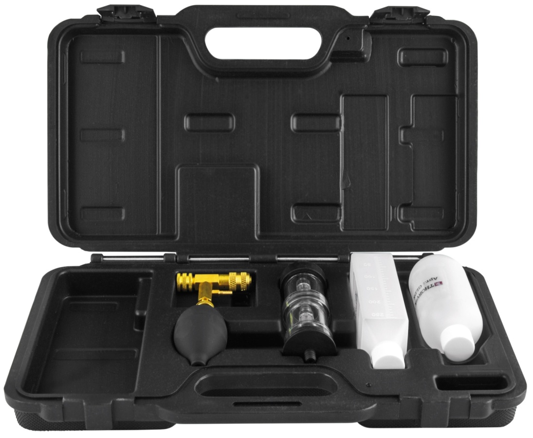 Набор для проверки утечек СО2 в системе охлаждения предназначен для быстрой и простой диагностики прогоревших прокладок и треснувших головок цилиндров путем проверки наличия CO2 в системе охлаждения.