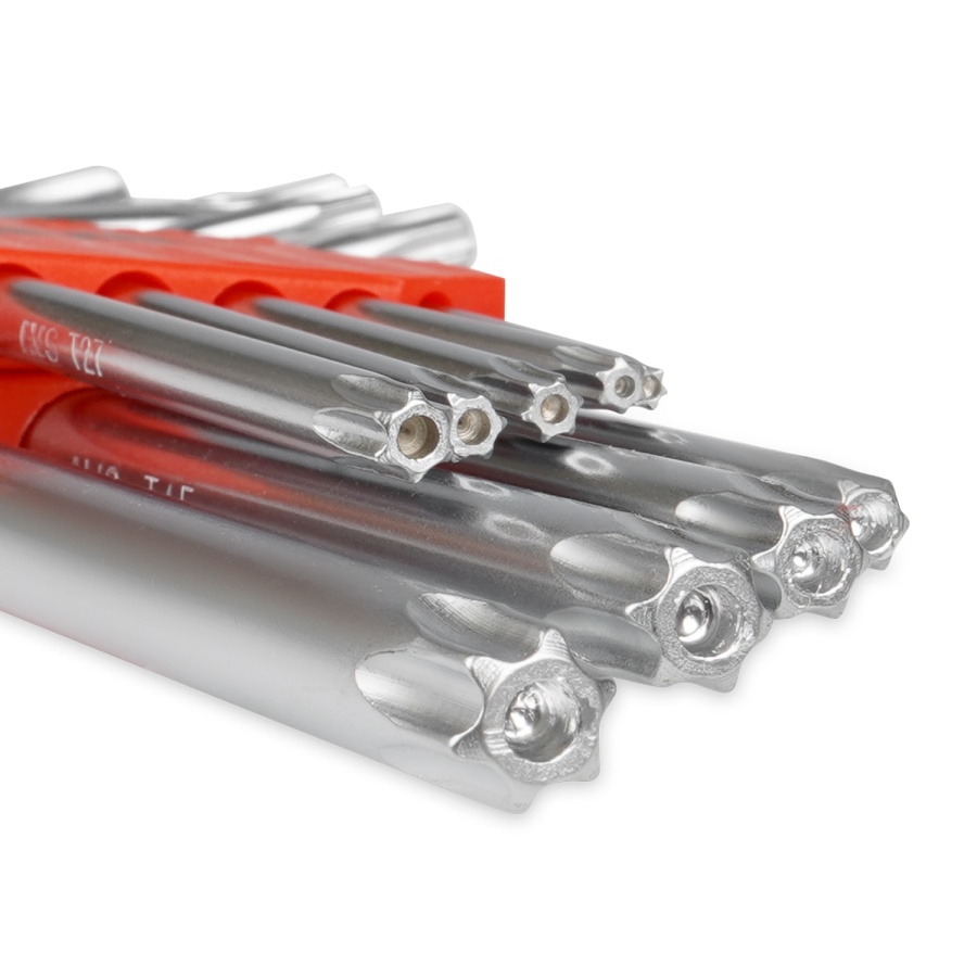 Набор состоит из 9-ти Г-образных ключей TORХ с отверстием, в пластиковом держателе. Предназначен для работы с соединениями с шлицем TORX.