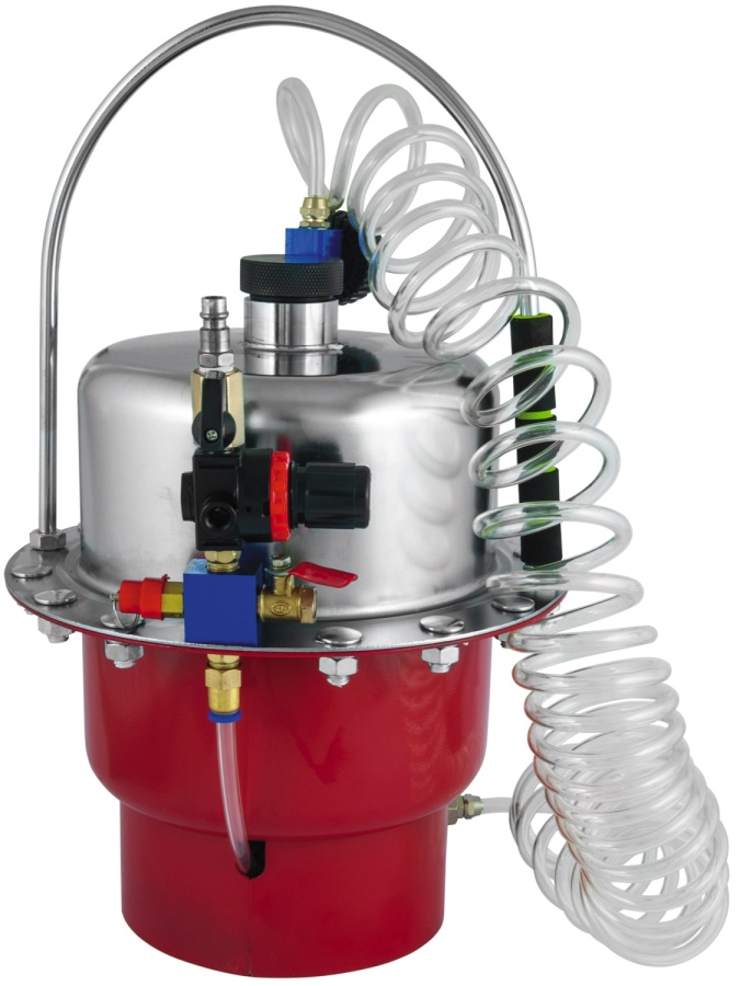 Приспособление с пневматическим приводом для замены тормозной жидкости в наборе с аксессуарами.