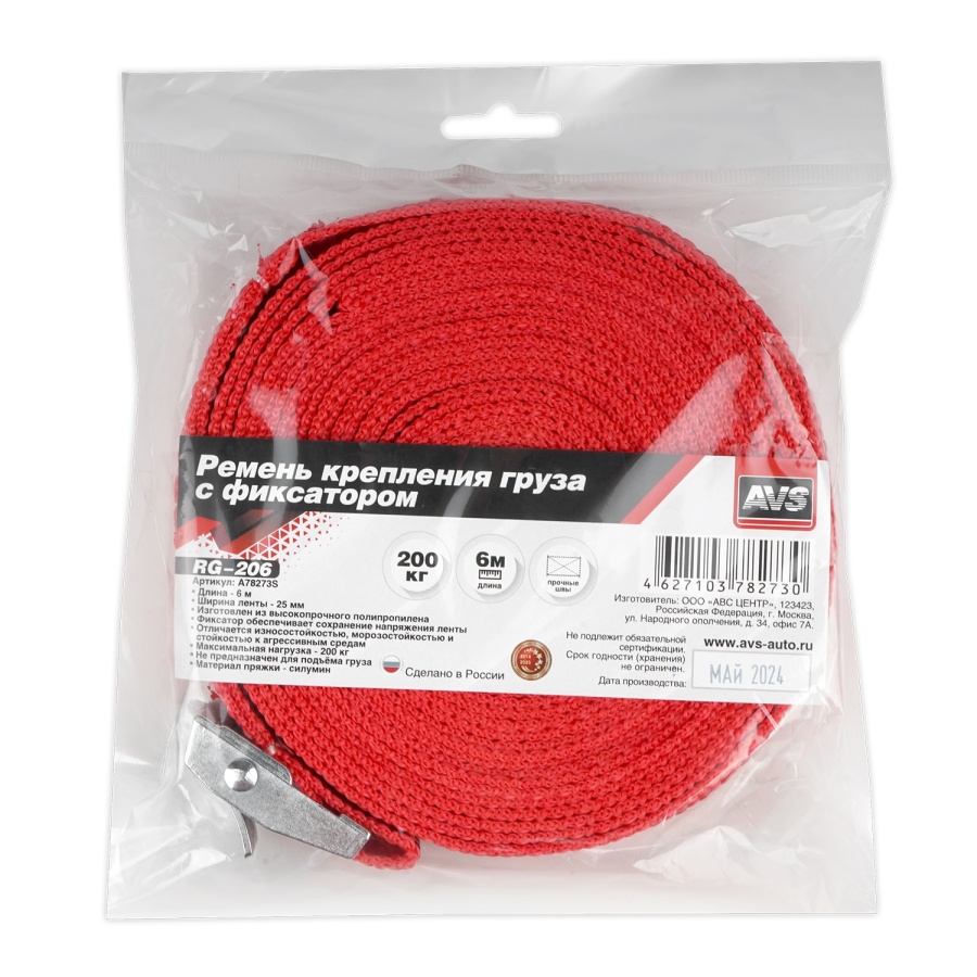 Ремень крепления груза с фиксатором 6 м, 200 кг, 25 мм AVS RG-206
