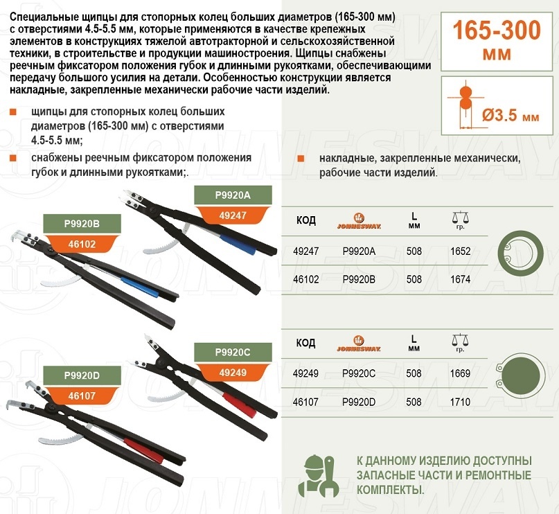 <p>Специальные щипцы для стопорных колец больших диаметров (165-300 мм) с отверстиями 4.5-5.5 мм. серии "Р99" применяются в качестве крепежных элементов в конструкциях тяжелой автотракторной и сельскохозяйственной техники, в строительстве и продукции машиностроения.</p>