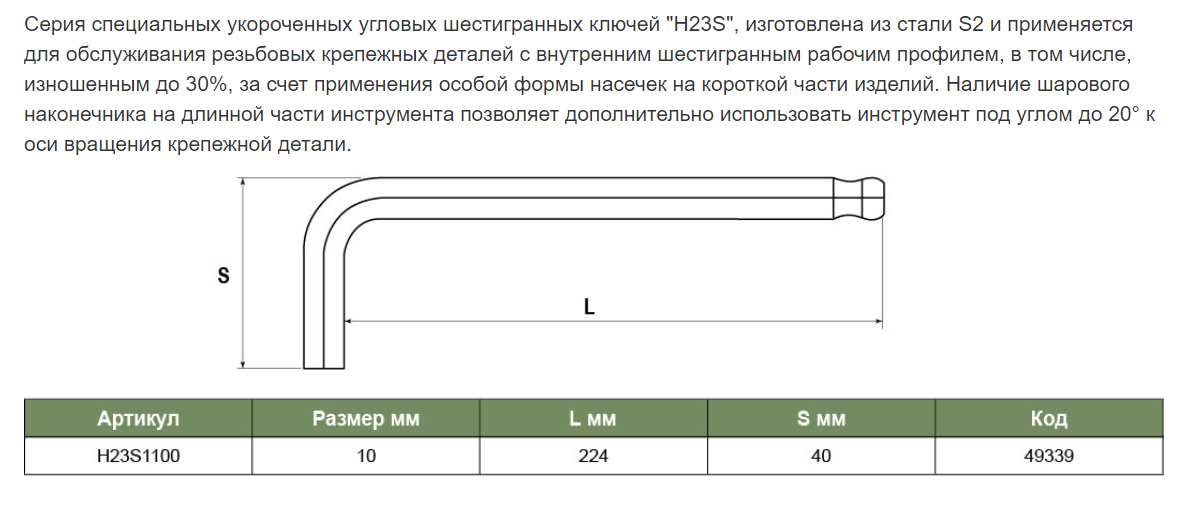 <p>Серия специальных укороченных угловых шестигранных ключей "H23S", изготовлена из стали S2 и применяется для обслуживания резьбовых крепежных деталей с внутренним шестигранным рабочим профилем, в том числе, изношенным до 30%, за счет применения особой формы насечек на короткой части изделий. Наличие шарового наконечника на длинной части инструмента позволяет дополнительно использовать инструмент под углом до 20° к оси вращения крепежной детали.</p>