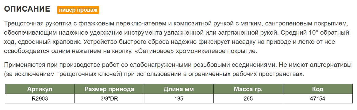 <p>Трещоточная рукоятка (трещотка) Jonnesway R2903 с флажковым переключателем и композитной ручкой с мягким, сантропеновым покрытием, обеспечивающим надежное удержание инструмента увлажненной или загрязненной рукой. Средний 10 градусный обратный ход, сдвоенный храповик. Устройство быстрого сброса надежно фиксирует насадку на приводе и легко от нее освобождается одним нажатием на кнопку. «Сатиновое» хромоникелевое покрытие.</p>