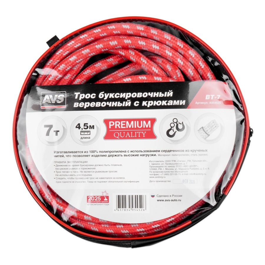Трос буксировочный веревочный с крюками 7т 4,5м AVS BT-7 в сумке