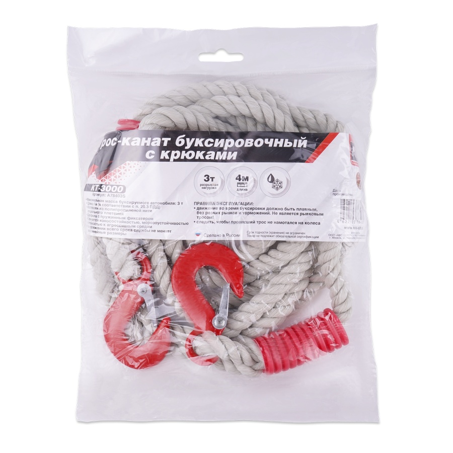 Трос-канат буксировочный с крюками AVS KT-3000 3т 4м, в пакете