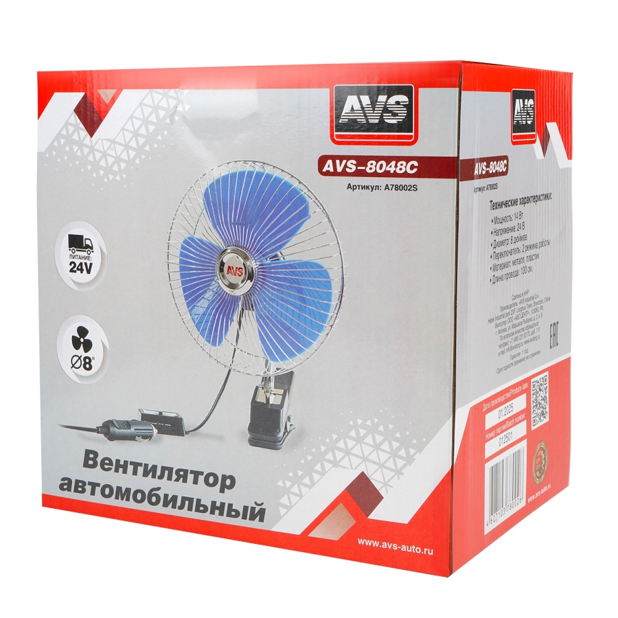 Вентилятор автомобильный AVS 8048C 24В 8" (корпус: металл, переключатель, цвет: серебристый)