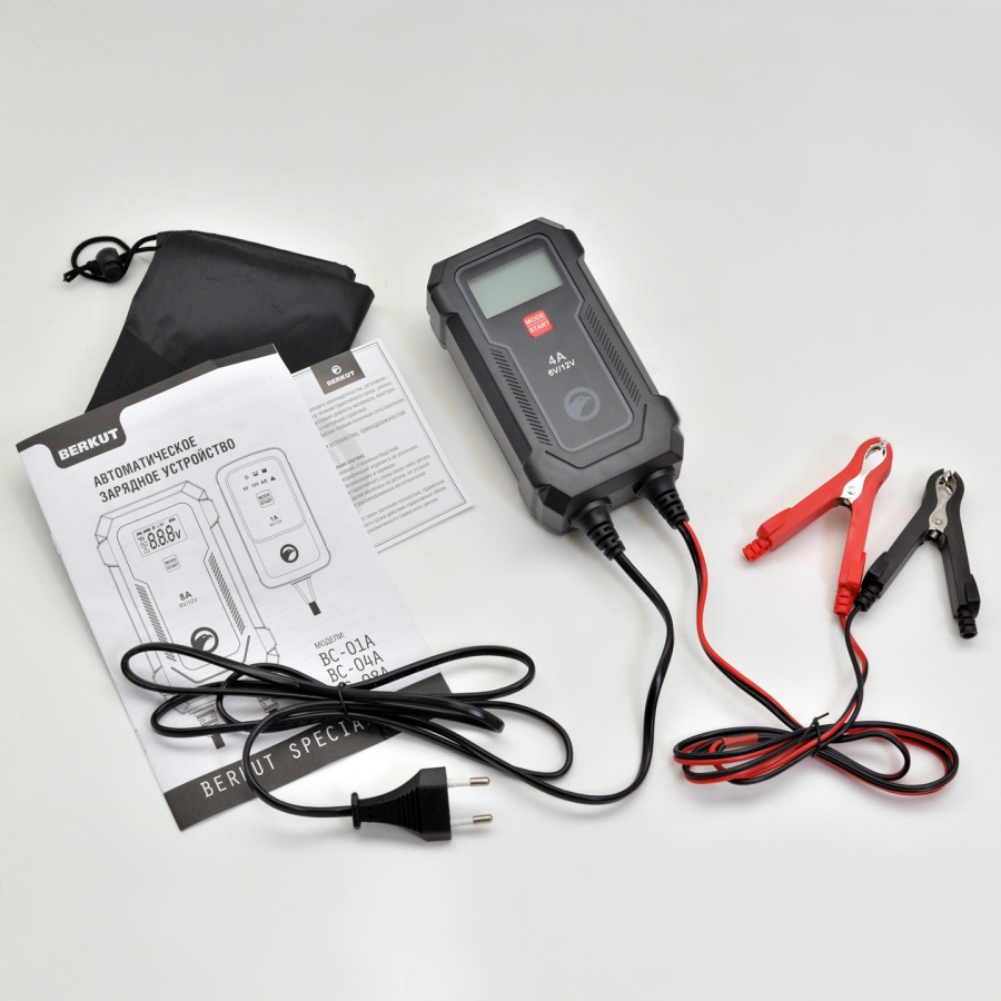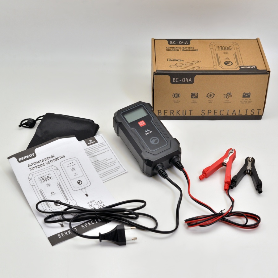 Зарядное устройство BERKUT BC-04A — полностью автоматическое устройство, предназначенное для обслуживания и зарядки 6 и 12-Вольтовых аккумуляторных батарей емкостью от 4 до 90 Ач, используемых в мото- и садовой техники и т.п. Устройство является полностью автоматическим и имеет поэтапный поэтапным алгоритмом зарядки в 9 стадий.