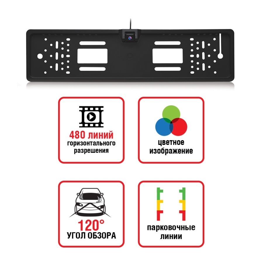 Камера заднего вида в рамке номерного знака поможет не упустить никаких деталей при парковке. Может быть подключена как к выносному монитору, так и к штатной системе автомобиля. Рейтинг защиты от воды и пыли IP-67 обеспечит долгую и надежную службу камеры.