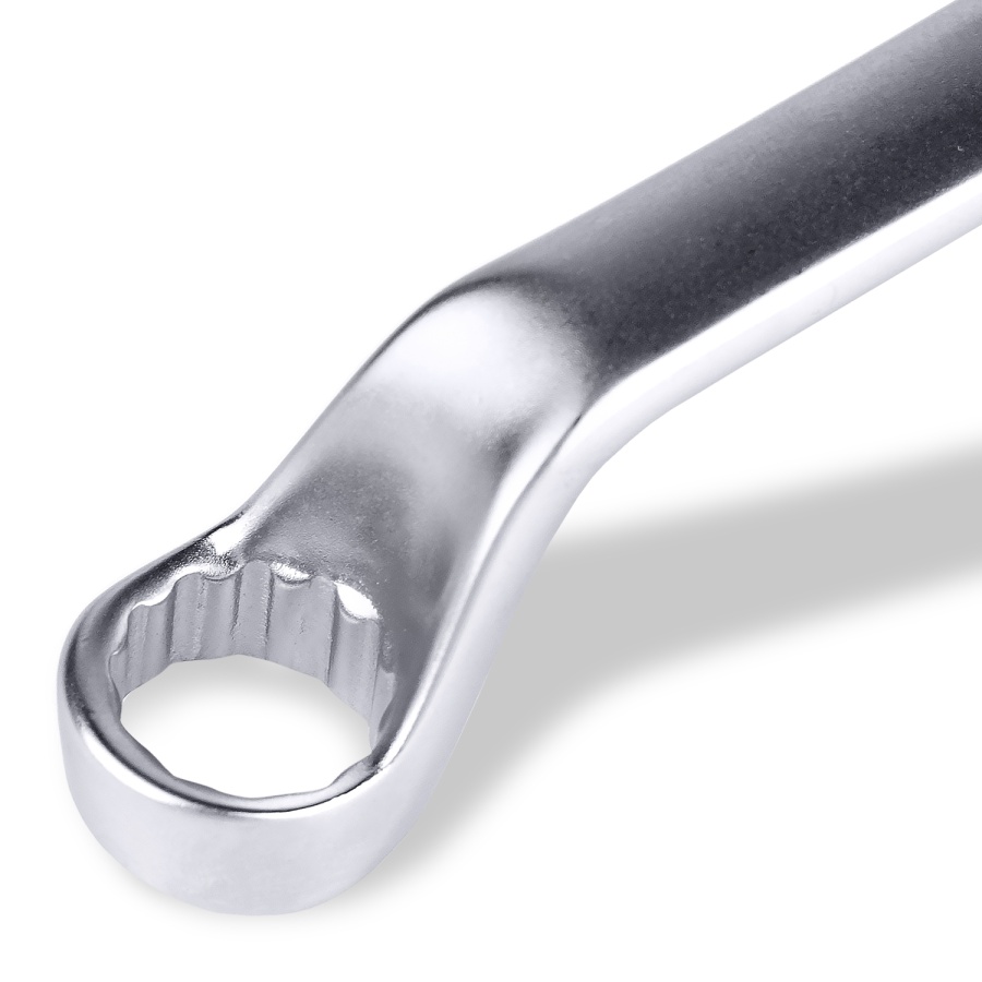 Накидной ключ – это рукоять и зажимная часть, которая охватывает весь периметр гайки. Он более удобен в эксплуатации и надежнее фиксирует крепеж, чем рожковый. Применяется для работ с высоконагруженными резьбовыми соединениями. Изогнутая на 75° коленчатая рабочая часть облегчает доступ в труднодоступные места. Кольцевые ключи имеют 12 граней. 12-тигранный ключ более распространен в использовании (поворот на 30 градусов). Из-за большого пятна контакта вероятность деформации углов сведена к нулю. Ключи изготавливаются из легированной хромованадиевой стали по стандарту DIN 838, в соответствии с ГОСТ 2906-80.