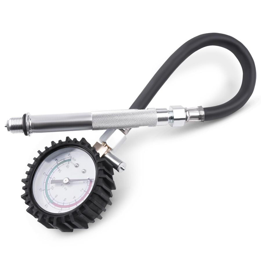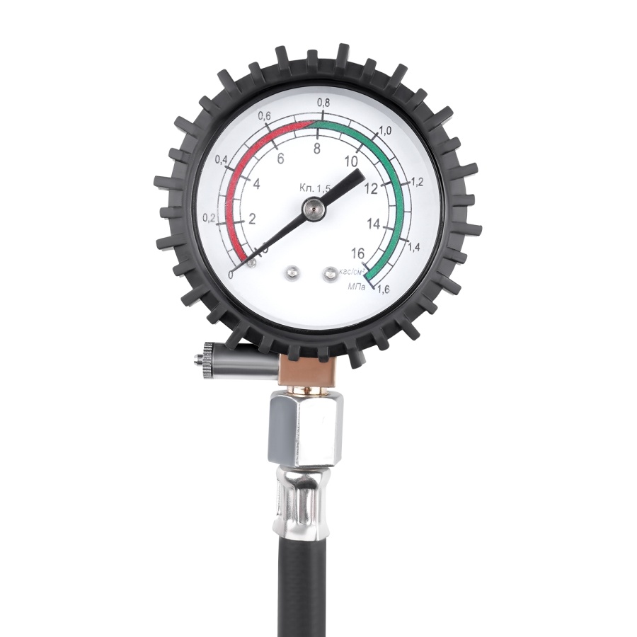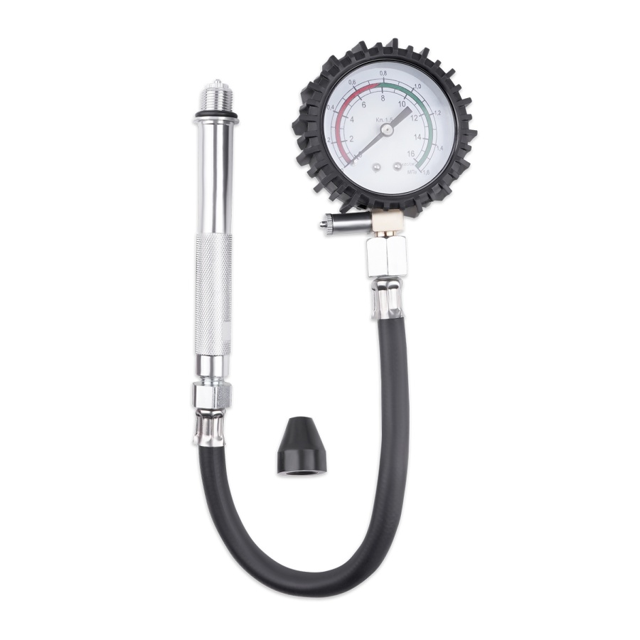 Компрессометр состоит из манометра в защитном резиновом чехле, гибкого присоединительного резинового шланга и конусной резиновой втулки, клапана сброса, запорного клапана, присоединительной втулки с резьбой M14x1,25.