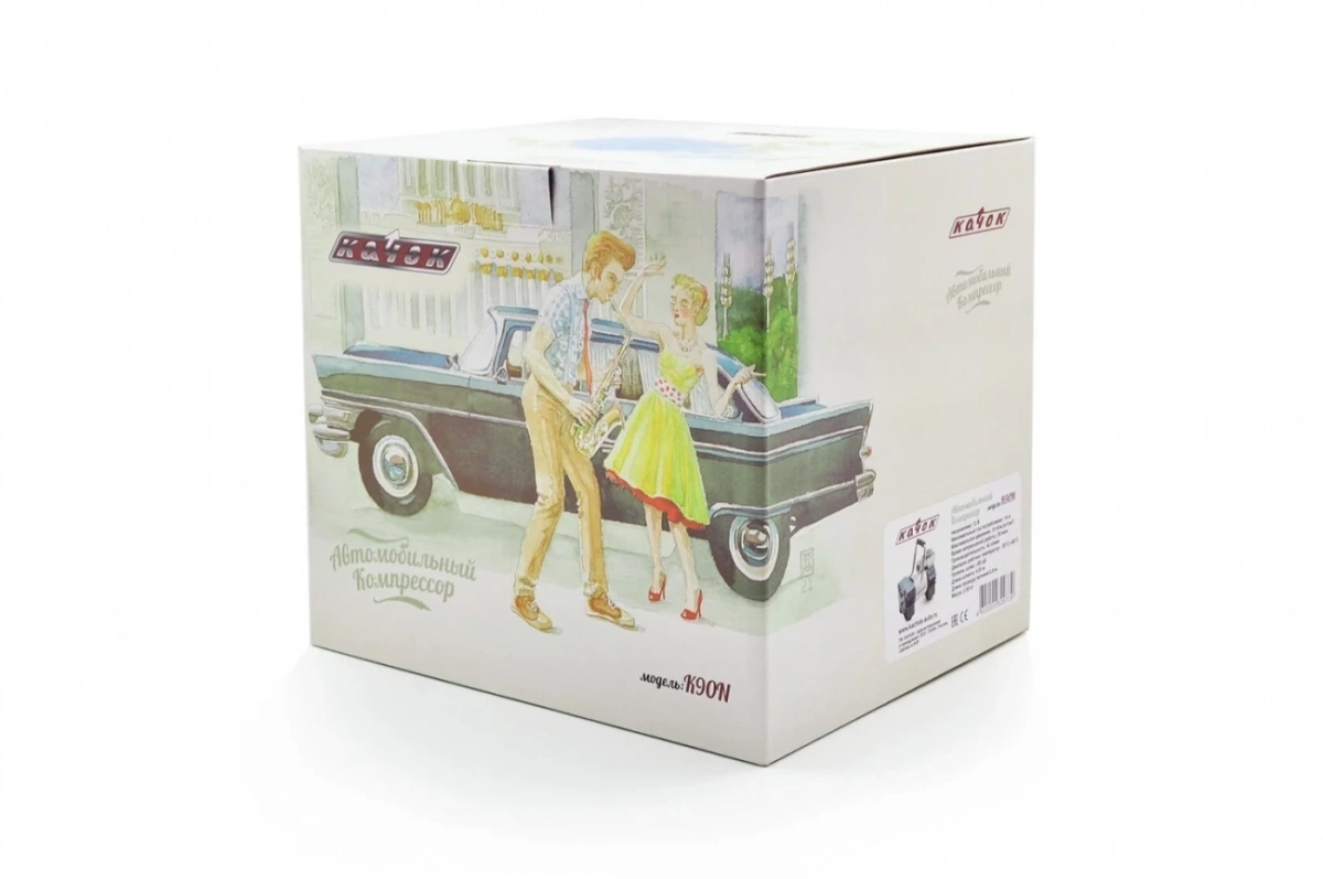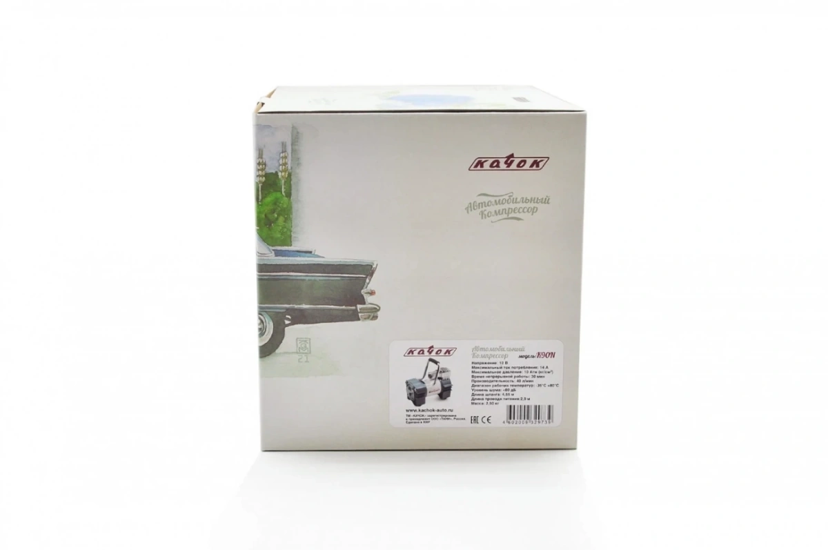 <p>Технические характеристики компрессора Качок K90N:<br />Допустимое напряжение: 10-13,5 В<br />Максимальный ток потребления: 12 А<br />Максимальное давление: 10 Атм. (кг/см2)<br />Время непрерывной работы: 30 мин.<br />Производительность: 40 л/мин.<br />Рабочая температура: -35°С +80°С<br />Масса: 2,5 кг<br />Навинчивающаяся насадка на ниппель колеса<br />Подключение в прикуриватель + адаптер для подключения к клеммам АКБ<br />Спускной клапан – DEFLATOR<br />Универсальный витой шланг - удлинитель - 4.55 м<br />Встроенный плавкий предохранитель - 15A<br /><br />Комплект поставки:</p>