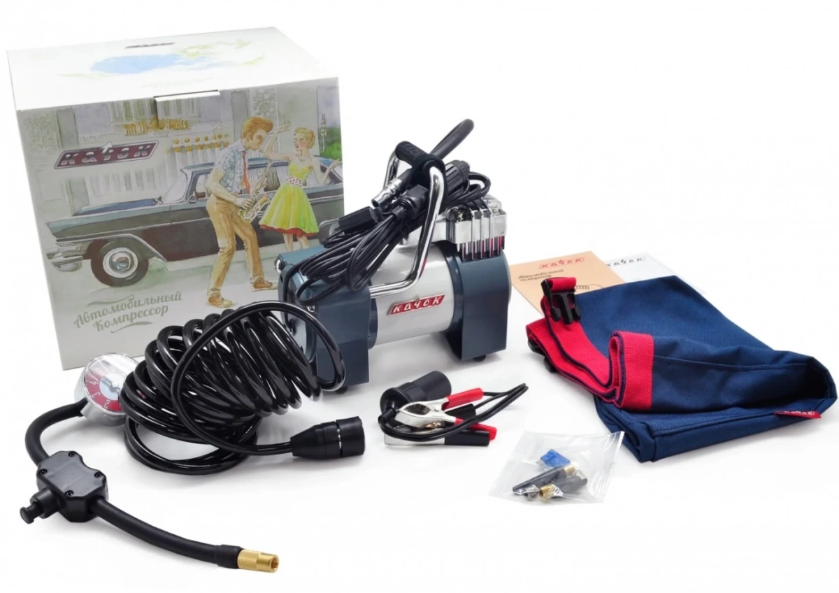 <p>Компрессор Качок К 90 N<br />Переносная сумка для хранения<br />Набор переходных штуцеров для надувных изделий - 4 шт.<br />Адаптер-переходник на клеммы АКБ - 1 шт.<br />Инструкция по эксплуатации<br />Упаковочная коробка</p>