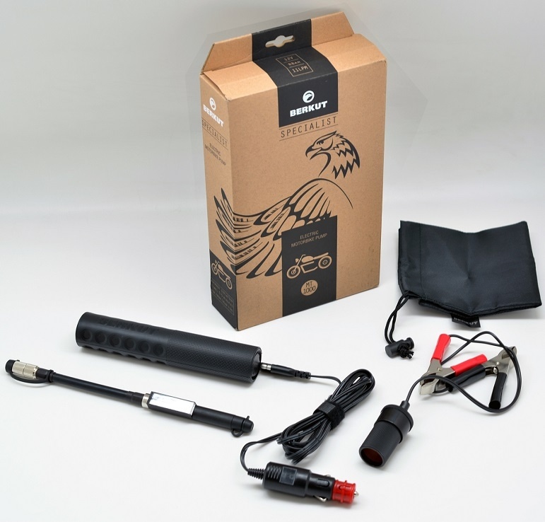 <p>Сверхкомпактный компрессор BERKUT MT-1000, работающий от сети 12 V. При своих миниатюрных габаритах (177 х d31 мм) и массе всего 260 грамм - этот «малыш» способен выдавать порядка 11 литров воздуха в минуту, нагнетая давление до 8 Bar. Время непрерывной работы составляет 9 минут. Для контроля давления во время накачки мотокомпрессор снабжен резиновым шлангом с двухшкальным манометром (Bar/Psi). Встроенный светодиодный фонарик поможет мотоциклисту качать колеса в темное время суток. Компрессор выполнен во влагостойком пыленепроницаемом исполнении и оснащен защитным резиновым кожухом. В комплектации к устройству предусмотрен провод для подключения к разъёму 12V и адаптер на клеммы АКБ, а также имеется сумка-чехол для хранения и переноски.</p>