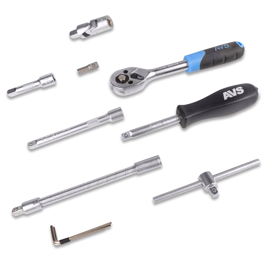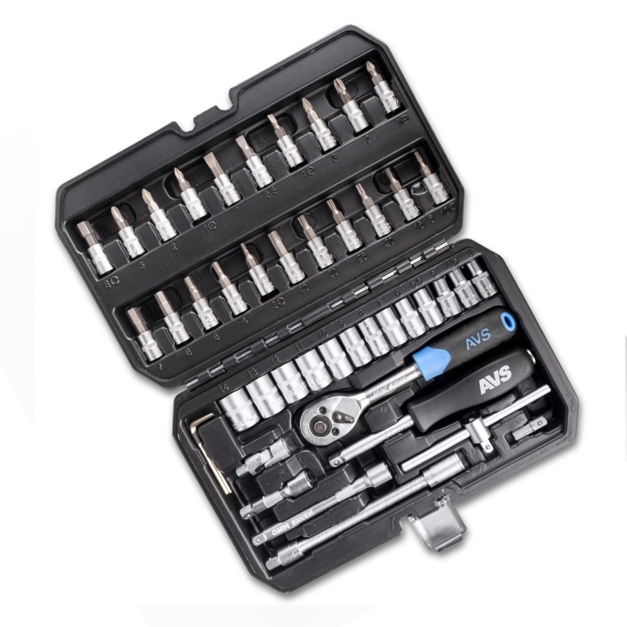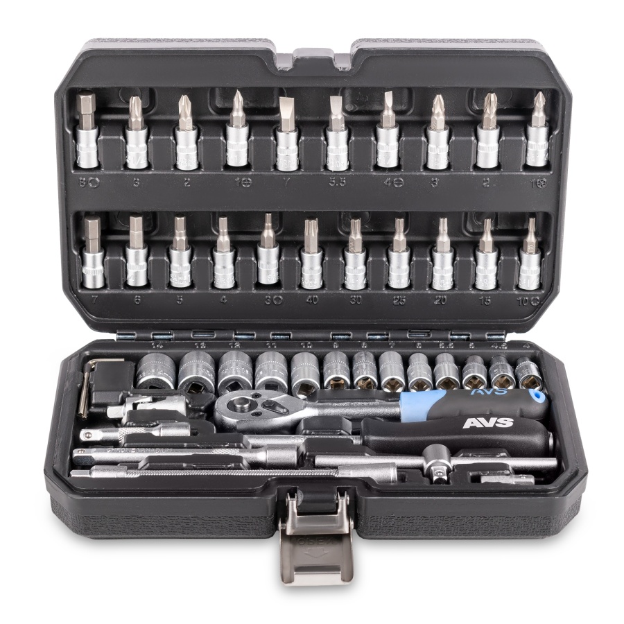 Набор инструментов AVS предназначен для ремонта и обслуживания автомобиля. Может быть использован в гараже, в мастерской или в быту. Все компоненты набора изготовлены из высокопрочной закаленной углеродистой стали, имеют матовое хромированное покрытие, благодаря чему отличаются высокой прочностью и долговечностью. Трещотка оснащена храповым механизмом на 45 зубцов и имеет двухкомпонентную эргономичную рукоять. В набор входит 46 предметов. Состав набора указан на упаковке. Прочный кейс для удобного хранения и транспортировки.
