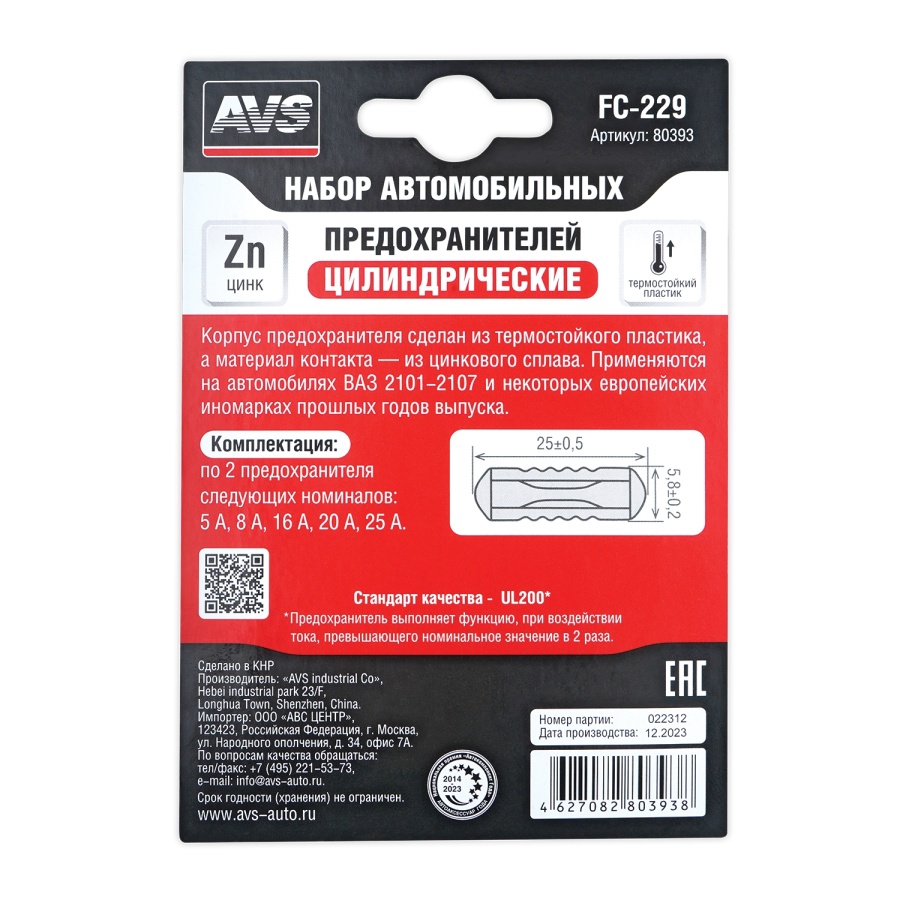 Набор предохранителей AVS FC-229 (цилиндрические) в блистере