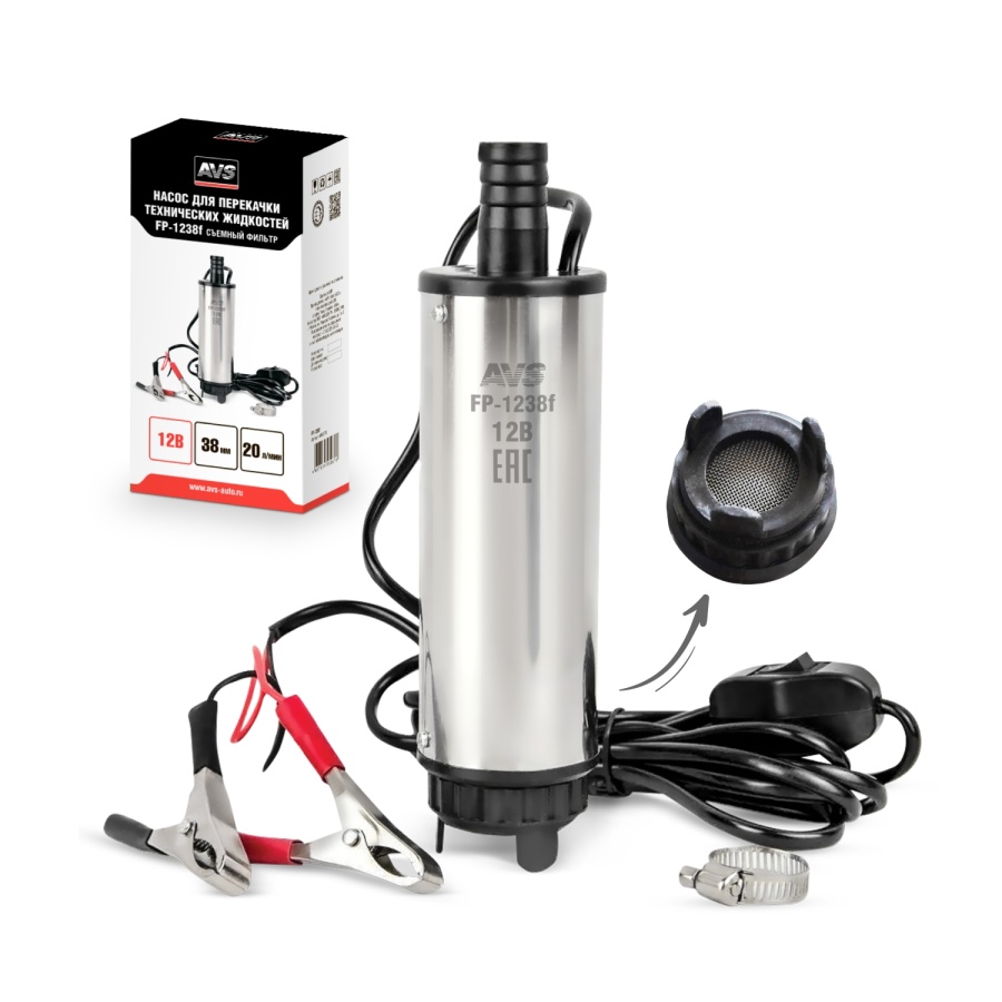 Насос для перекачки тех. жидкостей погружной AVS FP-1238f (12V/3,5А/20л/м./d=38 мм/съемный фильтр)