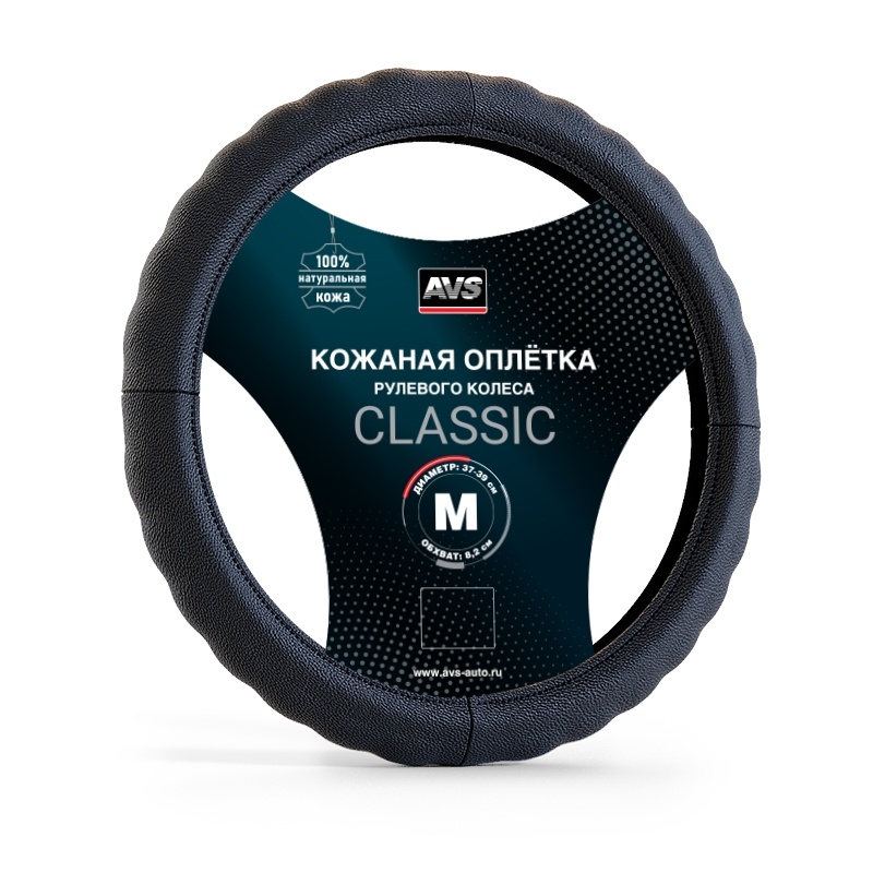 Оплетка на руль (нат. кожа) AVS GL-165M-B (размер M, черный) - Серия "Classic"