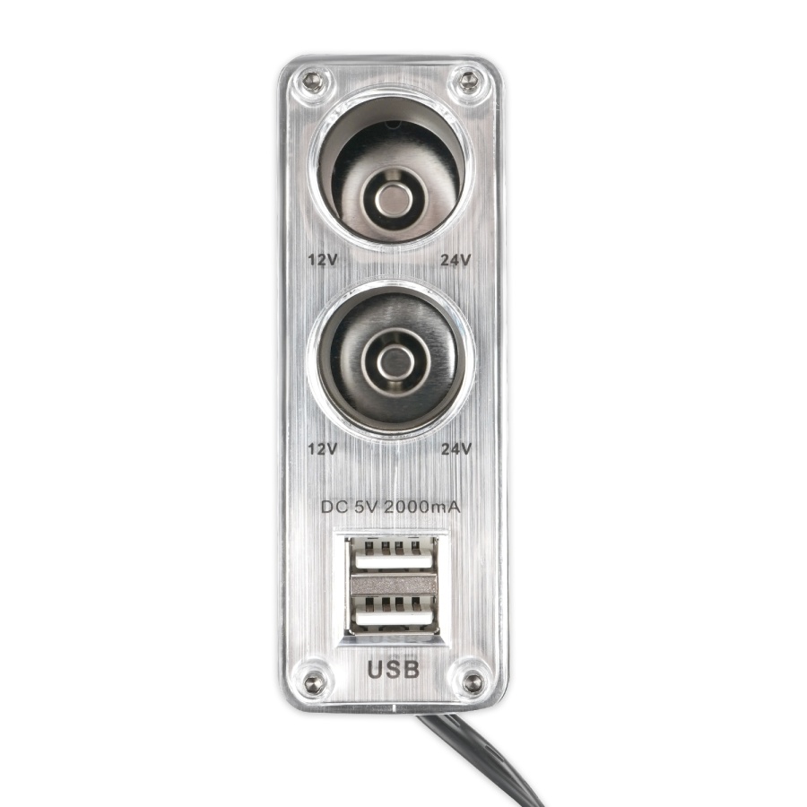 Разветвитель позволяет подключать до 4-х устройств одновременно в разъем прикуривателя через 2 разъема прикуривателя и 2 USB порта. Крепкое надежное устройство в корпусе из огнестойкого пластика. Защита от короткого замыкания и перепадов напряжения. Возможность установки в любой части автомобиля, благодаря проводу длиной 1 метр. Работа в сетях с номинальным напряжением 12В и 24В. Универсален для любых автомобилей.