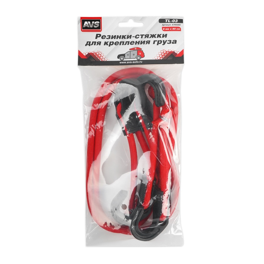 Резинка крепления груза 80 см х 8 мм, 2 шт (пластик.крючки) AVS TL-03