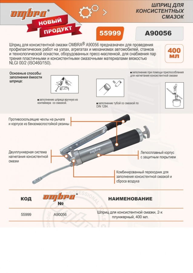 Шприц для консистентной смазки, 2-х плунжерный, 400 мл, Ombra A90056 (55999)