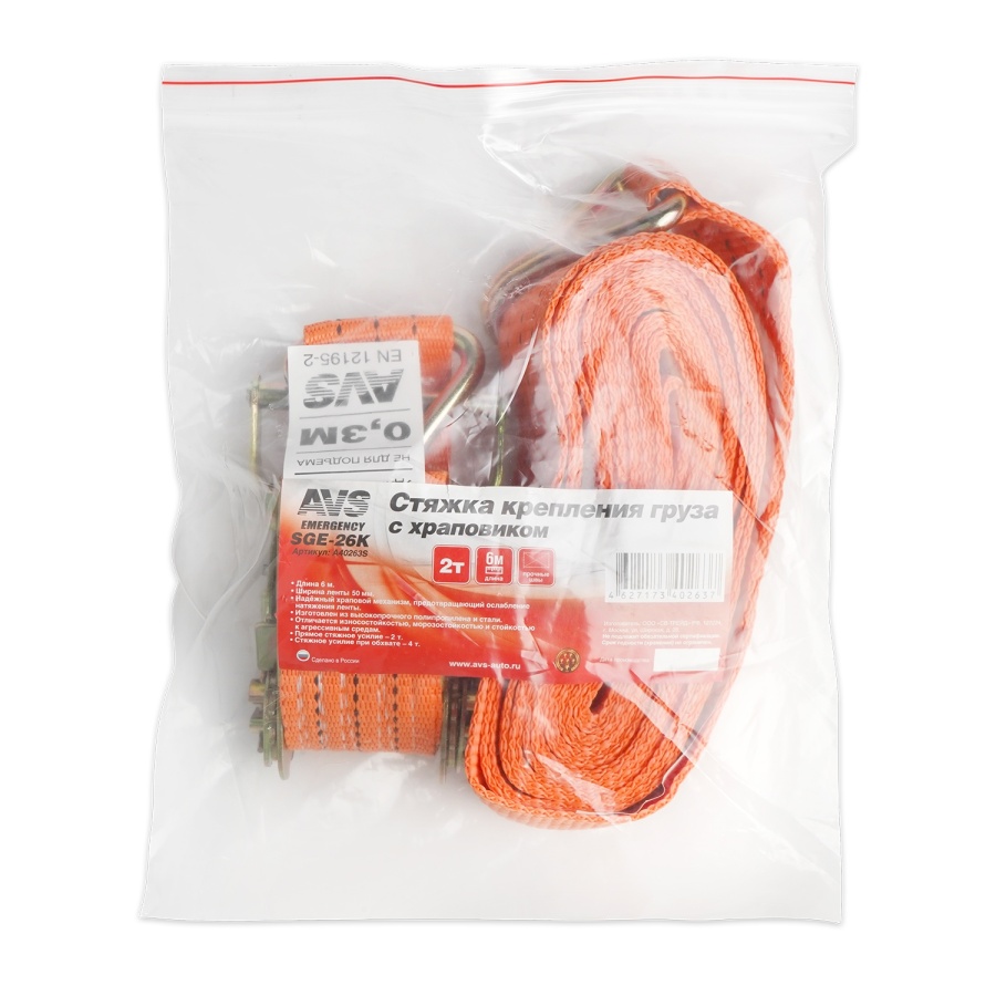 Стяжка крепления груза 6 м, 2 т, 50 мм с храповиком (эконом) AVS SGE-26K