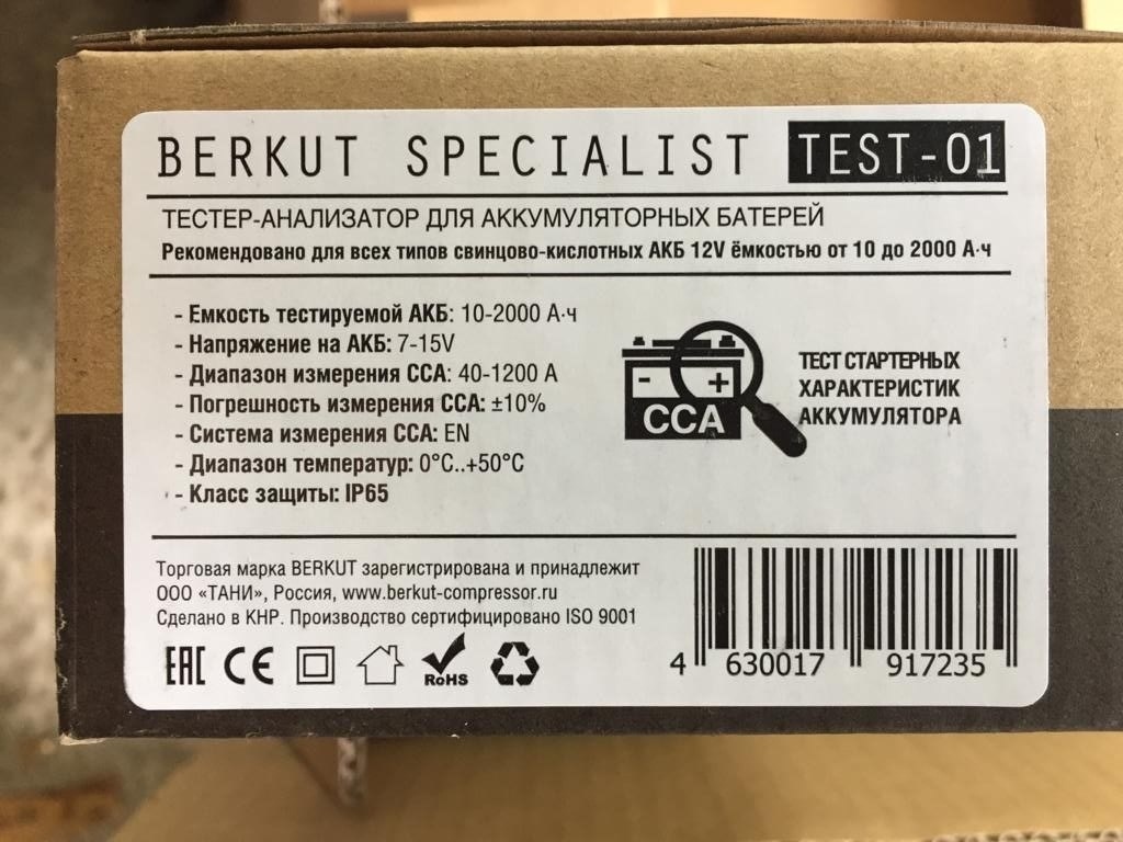 <p>Диагностический тестер - анализатор BERKUT SPECIALIST TEST-01 – для стартерных аккумуляторных батарей автомобилей и мотосредств с напряжением сети 12V обеспечивает быструю и точную проверку работоспособности батарей, оценку уровня заряда, замер пускового тока и уровень остаточной мощности АКБ.</p>