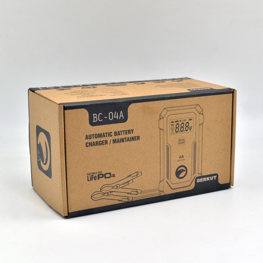Зарядное устройство BERKUT BC-04A — полностью автоматическое устройство, предназначенное для обслуживания и зарядки 6 и 12-Вольтовых аккумуляторных батарей емкостью от 4 до 90 Ач, используемых в мото- и садовой техники и т.п. Устройство является полностью автоматическим и имеет поэтапный поэтапным алгоритмом зарядки в 9 стадий.